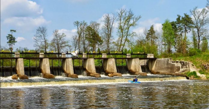 - 38,7 Mała Elektrownia Wodna II, jaz. Kajak przenosimy prawym lub lewym brzegiem 30-40 m. Dalej przepływamy przez dwa betonowe progi, chyba pozostałości po budowlach hydrotechnicznych. Przy średnim stanie wody nie odczuwamy żadnego spadku w korycie rzeki.