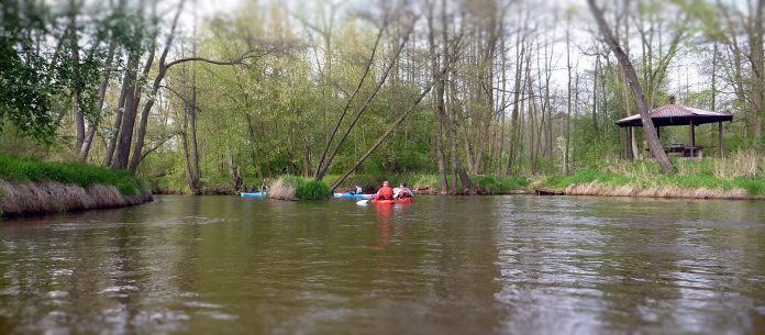 Wodujemy kajaki za w/w mostem na 34 km od ujścia, kilkanaście metrów od ruin zamku z XV wieku. Dookoła zamku ślady fosy łączącej się kiedyś z korytem rzeki. Drzewiczka w tym miejscu ma kilkanaście metrów szerokości i niestety często mało głębokości. Mijając zabudowania na lewym brzegu rzeki, powoli docieramy do znajdującej się 700 metrów dalej kładki dla pieszych. Docieramy to dobre słowo, bo chociaż nurt jest tutaj szybki, to cały czas szorujemy po żwirowatym i kamienistym dnie, szukając wody raz przy jednym, raz przy drugim brzegu. Udaje nam się na szczęście nie wysiadać z naszych polietylenów. W tym miejscu dla wielu kajakarzy w „szklakach” przydadzą się buty gumowe, ponieważ na tych brodach z bystrzami kajak z pewnością trzeba będzie holować. Za kładką wpływamy na dobre w leśne ostępy, gdzie rzeka fajnie przyspiesza, przyjmując z prawej strony małą rzeczkę Brzuśnię, podobno niosącą pierwszej klasy czystości wodę. Drzewiczka w dalszym ciągu się rozlewa, meandruje i parę razy rozwidla tworząc różnej wielkości wysepki, zmuszając do myślenia którą stroną płynąć, aby nie wpłynąć na mieliznę. W 40 minut przepłynęliśmy ok. 3 km. Rzeka zaczęła płynąć spokojniej, w głębszym i wąskim na 8-10 metrów korycie. Pojawiają się jednak powalone drzewa, które trzeba umiejętnie omijać, a których w wodzie na wiosną jest więcej niż na jesieni. Widać, że ktoś dba o ten szlak i go udrażnia , na szczęście z umiarem i miejmy nadzieję, że zgodnie z prawem. Ostatnio od Drzewicy do Odrzywołu nie było żadnej zwałki, która wymagałaby przenoszenia kajaków. Rzeka miejscami ma wysokie brzegi, po lewej stronie jest trochę łąk, po prawej cały czas las.